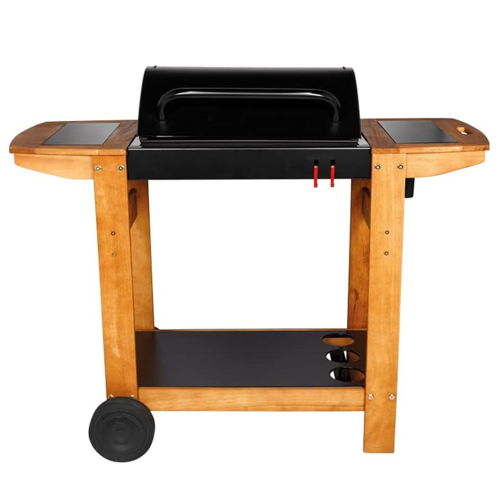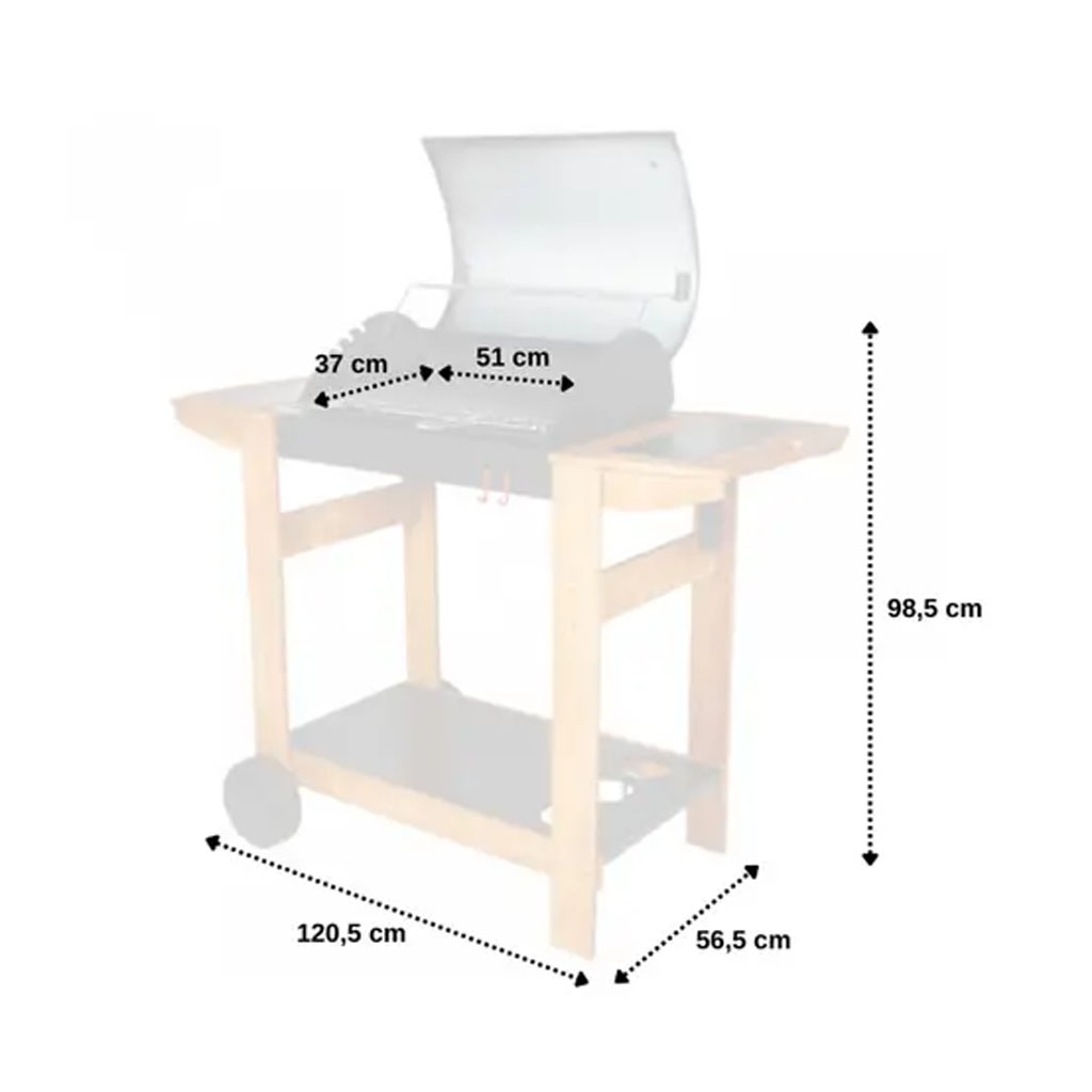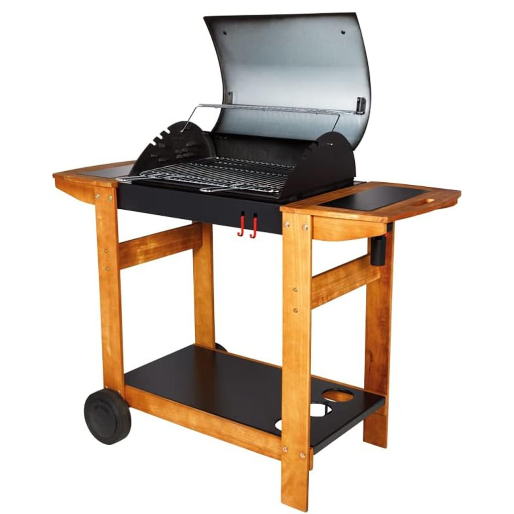 Barbecue au charbon avec chariot en bois et deux tablettes latérales