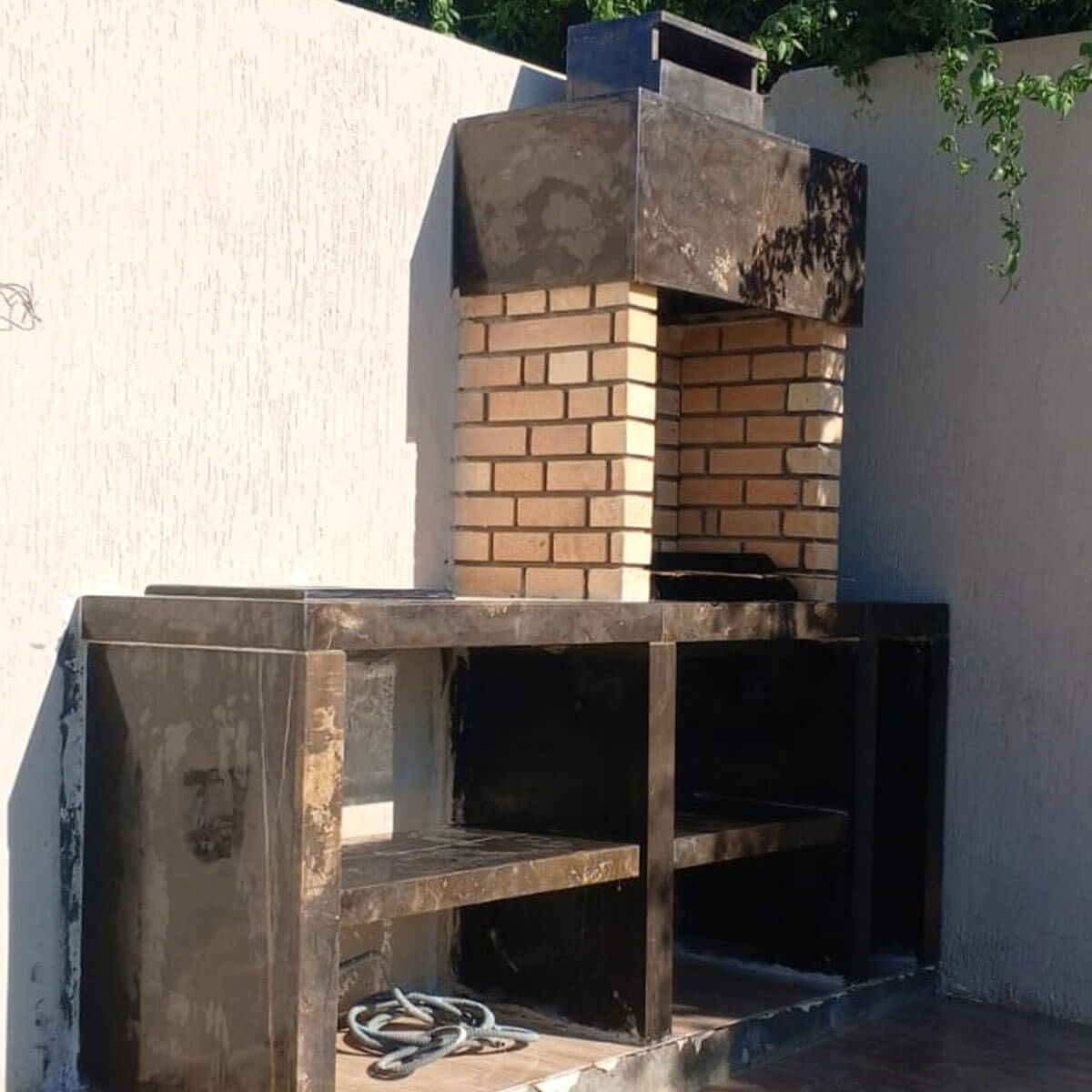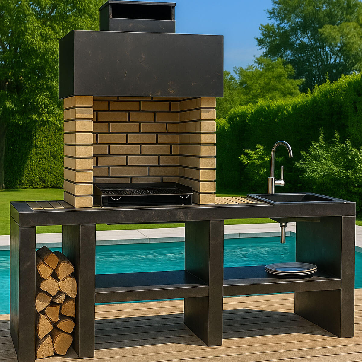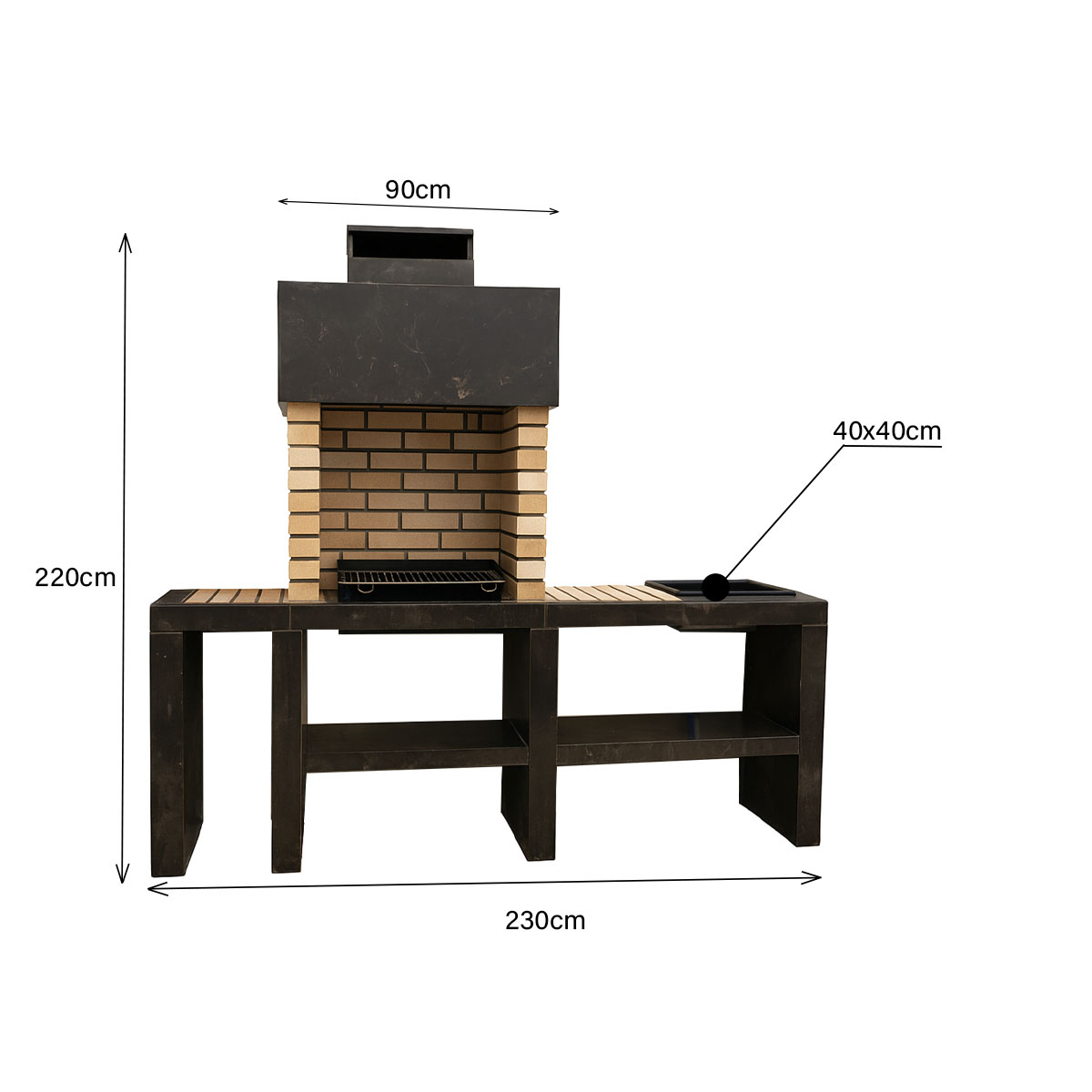 Barbecue de jardin en marbre et briques refractaires, barbecue avec plan de travail et extension pour l’evier integré, avec un grilloir encasteré d’une dimension de 230cm de longueur 55 cm de profendeur et 220 cm de hauteur.