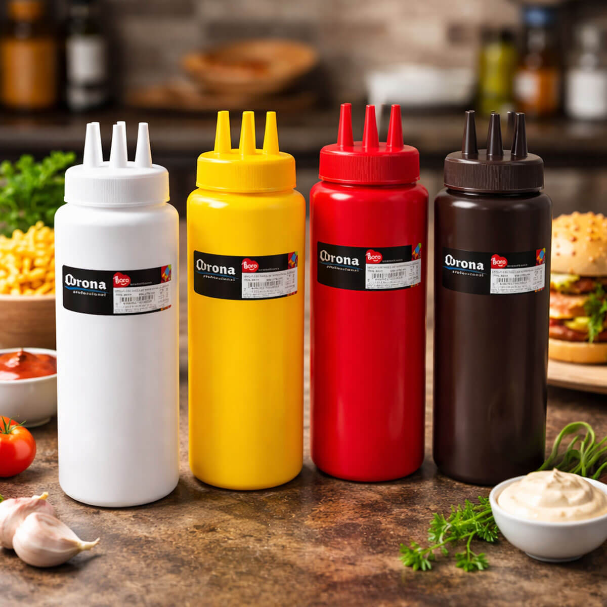 Ce produit professionnel facilite et contrôle le service des sauces dans les restaurants, cafés, hôtels et cuisines domestiques. Sa conception à 3 trous permet de servir ketchup, mayonnaise, moutarde et autres sauces liquides de manière uniforme et régulière. D’une capacité de 950 ml, il est économique pour les grandes quantités. Fabriqué en plastique de haute qualité, il est durable et résistant. Son corps transparent permet de visualiser et de contrôler facilement le niveau de sauce.