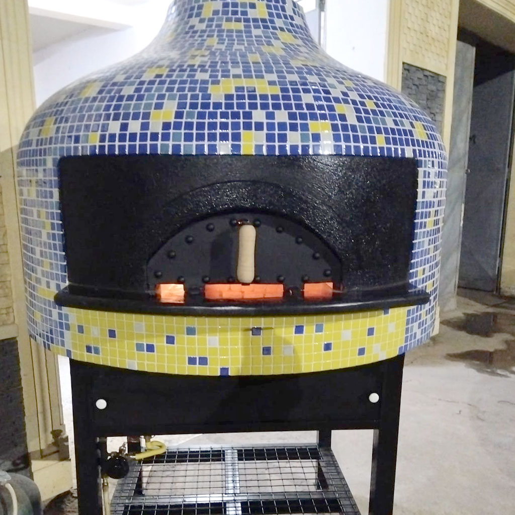 Four a bois et au gaz en mosaïque Pro120 MK- Ce four à bois est 100% fabriqué artisanalement Trois couches d’isolation industrielle thermique, intérieur en briques réfractaires et ciment fondu, prêt à utiliser dés le premier jour.